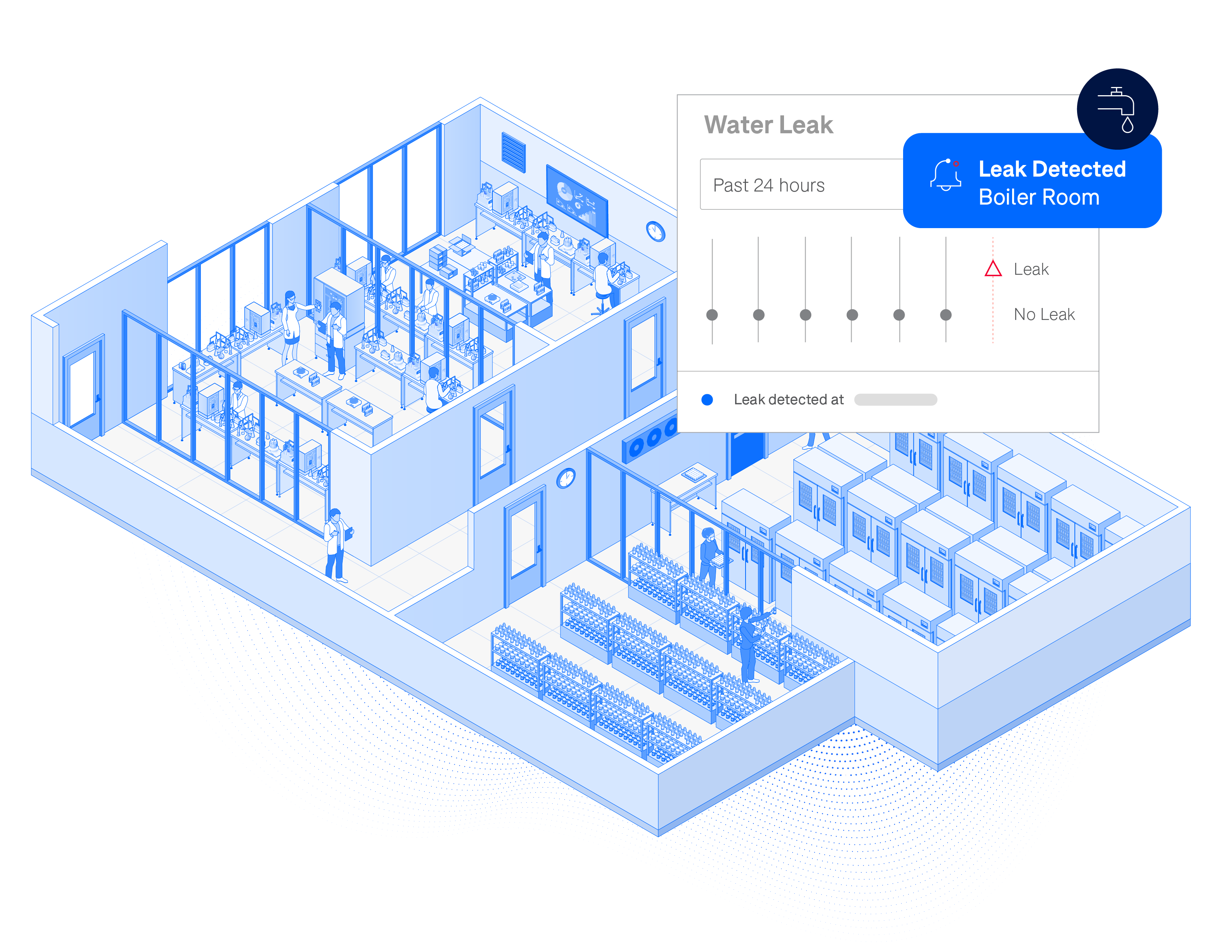 Real-time leak alerts and floor-plan visibility allow labs to quickly resolve issues, reducing the risk of water damage that could lead to equipment failure, invalidated research, and workflow disruptions.